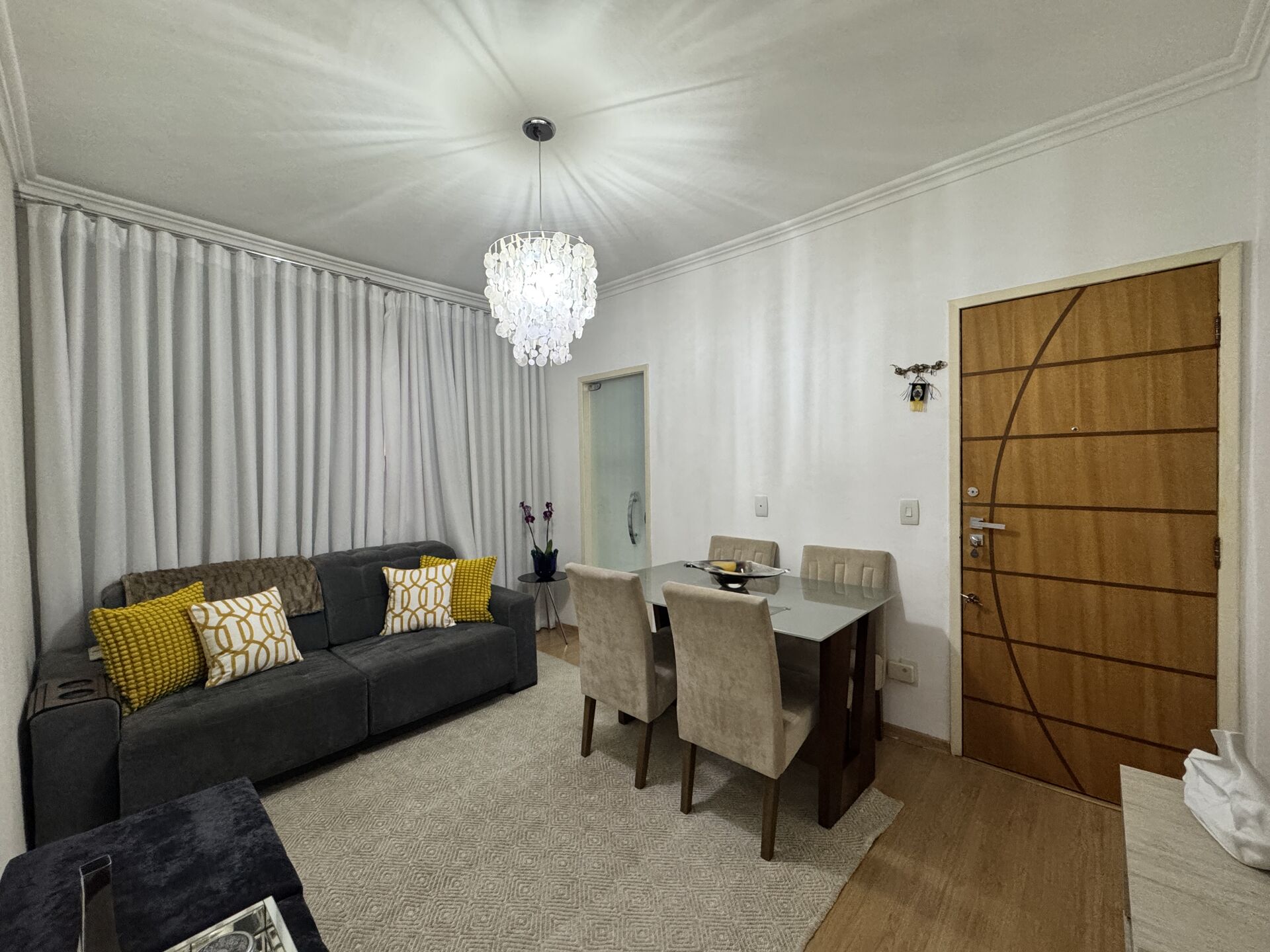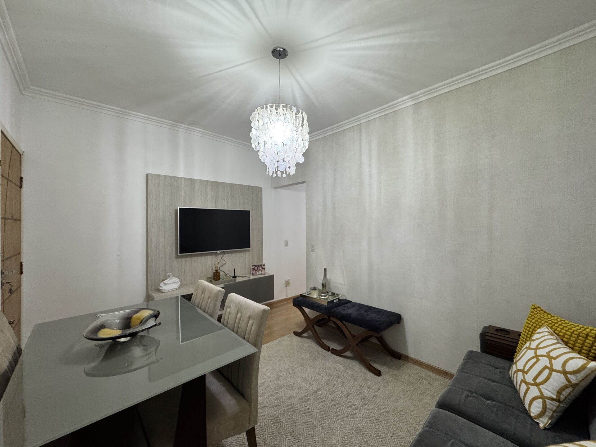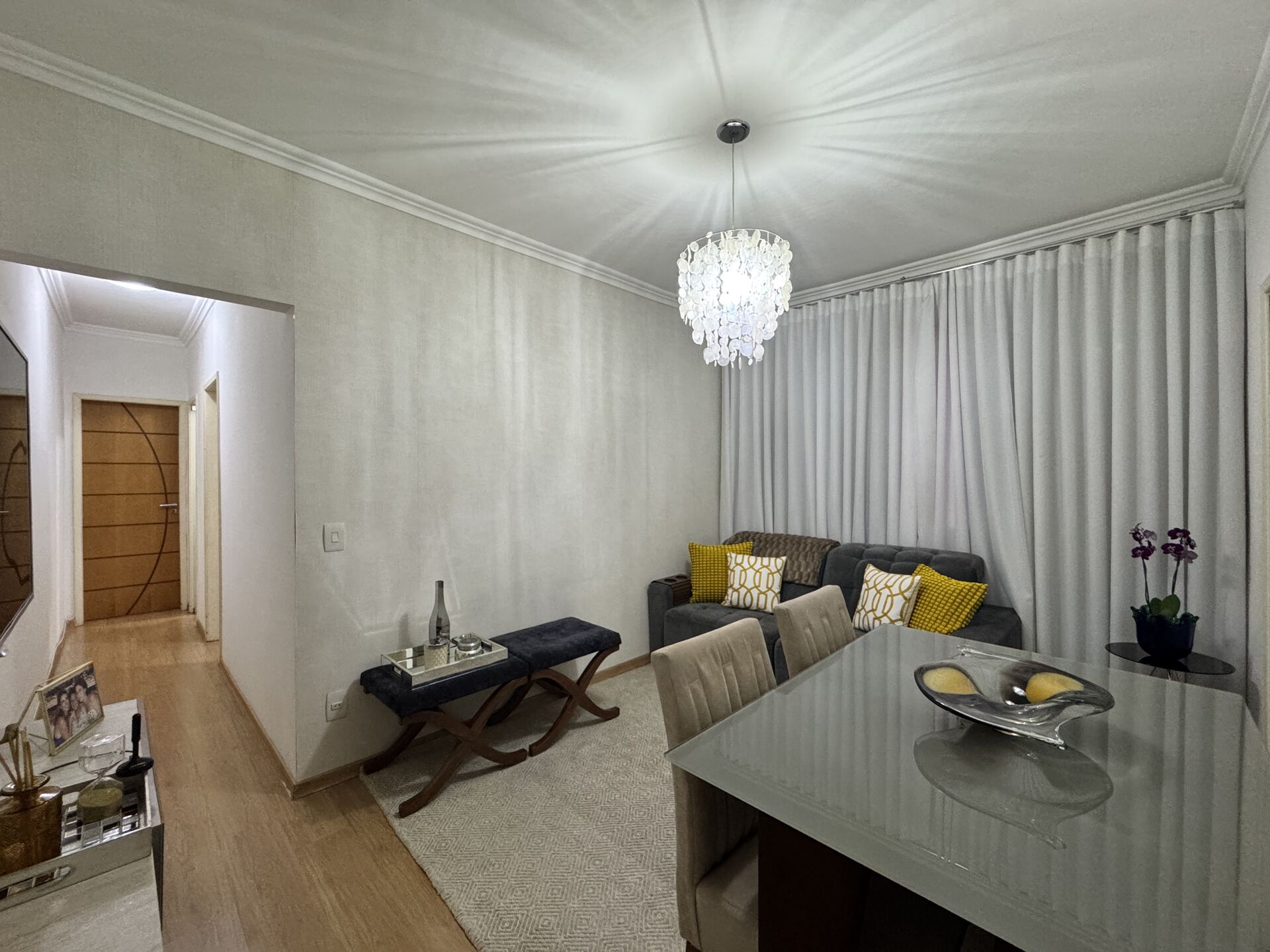 Sala: Mesa de madeira/vidro com quatro cadeiras, mesa de canto, dois bancos, televisor e cortina;