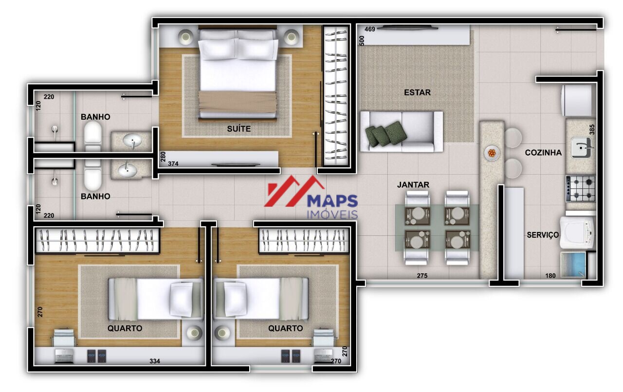 APARTAMENTO COM TRÊS QUARTOS, SENDO UMA SUÍTE - SALA - COZINHA - BANHEIRO SOCIAL/SUÍTE - ÁREA DE SERVIÇO.